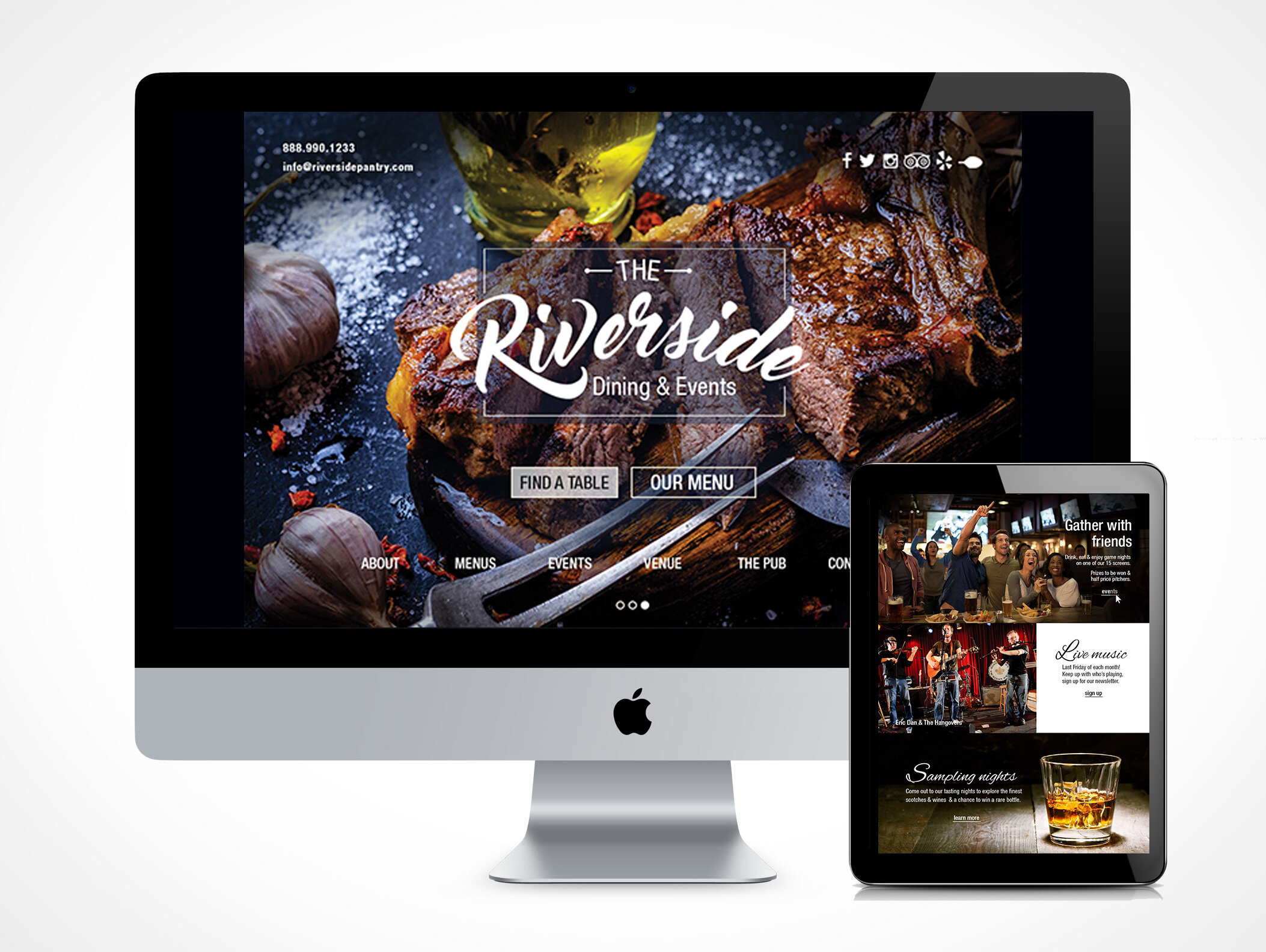 Project Overview: The Riverside was based on a business plan that we wrote during the first semester. In groups, my class group was assigned a real business that was lacking in an attractive or effective online presence. As a group, we were to write a business plan to help improve the business. My group was given an all-in-one event space, inclusive of a fine dining space and local pub. A large part of the project was to re-design the website and decide on the hierarchy of each aspect of the restaurant.